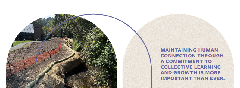 Restoring the section of Cochran Springs that runs through the EPS campus is one example of this valuable “hyperlocal connection.” This partnership originated in student-led projects, the Upper School Environmental Club’s salmon release project and Burton Barrager’s Environmental Practices 7 students’ study of our backyard ecosystem, and is now an ongoing official salmon-recovery restoration partnership with the City of Kirkland and King Conservation District. Last October, led by the Environmental Club, about eighty EPS students, parents, and staff removed invasive blackberry bushes in two sections of the creek, improving habitat and water quality to support salmon and orca health. This work had been a goal of EPS students and science faculty for many years and the specific partnership work began pre-COVID, so it has been immensely rewarding to take action and see significant progress. Hagen echoes Uzwack’s thoughts on the importance of hyperlocal partnerships, noting that it is important for students to ask themselves, “What’s happening in my neighborhood?” and then to get involved.