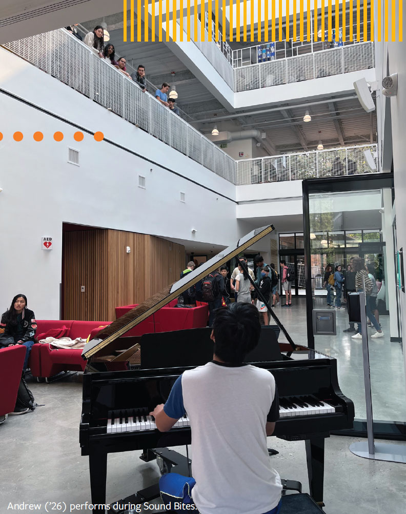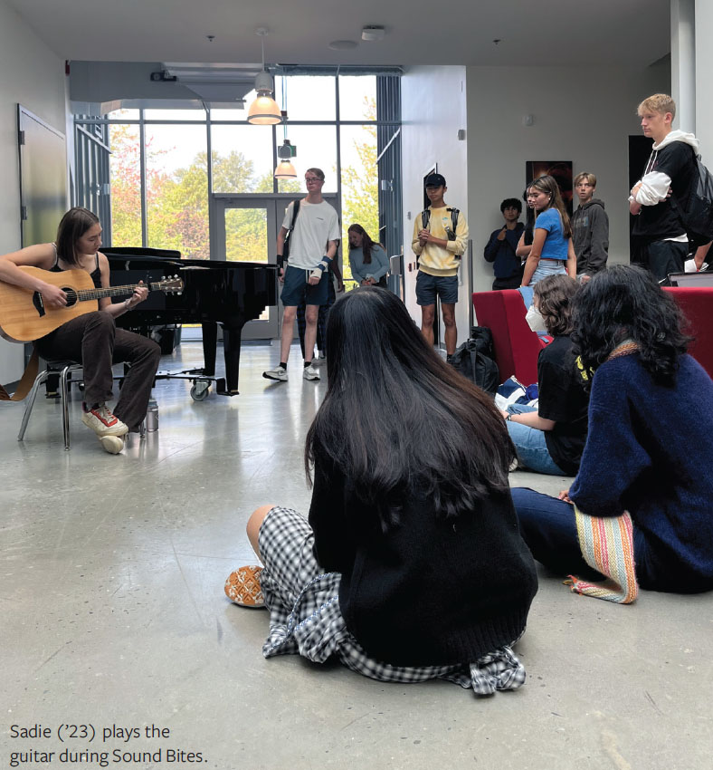Music often exists in a specialized world that is trained and formalized, and performances happen on stage at the end of a long process of learning. How might students gain performance experience with so few opportunities to do so? As arts educators, F&PA faculty recognized a need for students to practice performance skills in a casual setting more regularly throughout the trimester. As a result, Sound Bites was created. Sound Bites is a casual music series featuring upper schoolers and faculty/staff alike sharing their work during the middle band on Fridays in the TALI atrium. Sound Bites had a soft start in the spring of 2022 and has continued strong this year, 2022-2023. The benefits of sharing music casually in the halls are experienced by the performers as well as the community.