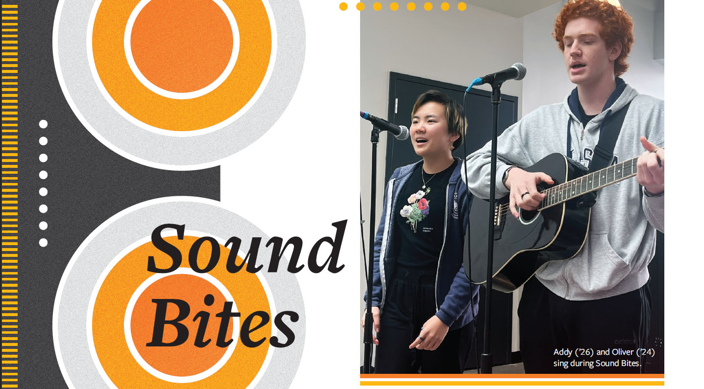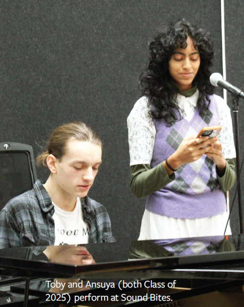 By sharing their work informally, students practice managing performance anxiety. All performers experience nerves associated with sharing, even the professionals, but the seasoned artists know what to expect and have a personal routine in preparation of performance. There is no way to gain this experience without doing it, and it can be an uncomfortable part of the artistic process. It requires vulnerability and is particularly challenging when the audience is made up of your peers, so the more opportunity to practice in a low-stakes environment, the easier it will be to perform in one that is formal. Oliver (’24), has performed several times on voice and guitar and says, “Sound Bites allowed me to practice my musical skills and show my community what I can do without too much pressure.”