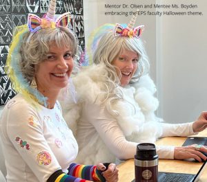 Jen is a wonderful and easy mentee to work with since she brings so much experience, dedication, and drive to jump into all aspects of EPS! Jen has a lot of teaching experience so she really hasn’t needed much from me recently. I worked more with Jen in the fall trimester as she was learning OneNote and our EPS conventions. For Halloween, Jen went all out dressing up in our faculty and staff theme this year: rainbows and unicorns, so I put more effort into my costume than usual. We picked up unicorn headbands at Goodwill, and as we were sitting at a table bouncing ideas off each other, which has been a highlight of this partnership, someone took a photo. It captured a great moment in our relationship, diving into EPS culture, sharing teacher ideas, enjoying being silly, and connecting.”